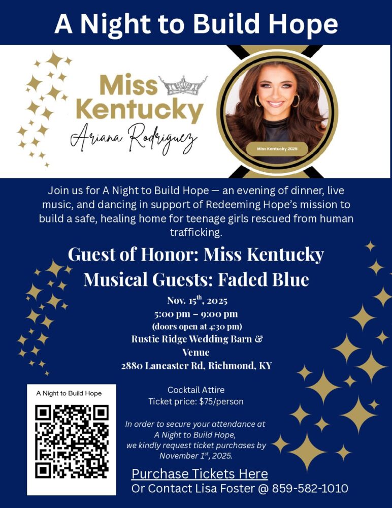 Looking for something meaningful to do this November? Join us for A Night to Build Hope — an inspiring evening of dinner, live music, and dancing in support of Redeeming Hope’s mission to build a safe, healing home for teenage girls rescued from human trafficking.